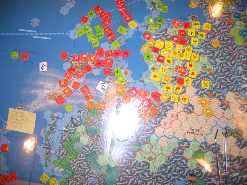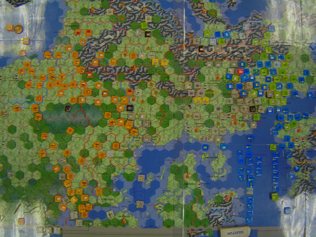 END Europe: Final positions in Europe. As you can see given another impulse or two Russia would have had a good crack at Warsaw and Budapest, and the Russian Marine could have flipped into Helsinki. The Western Allies having achieved a complete breach of the Rhine and nothing really stands between them and the heartlands of Germany.