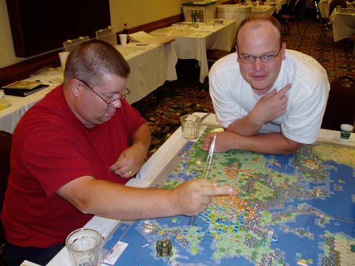 Bill Duncan points dramatically and Steve mugs for the camera as Germany crumbles...